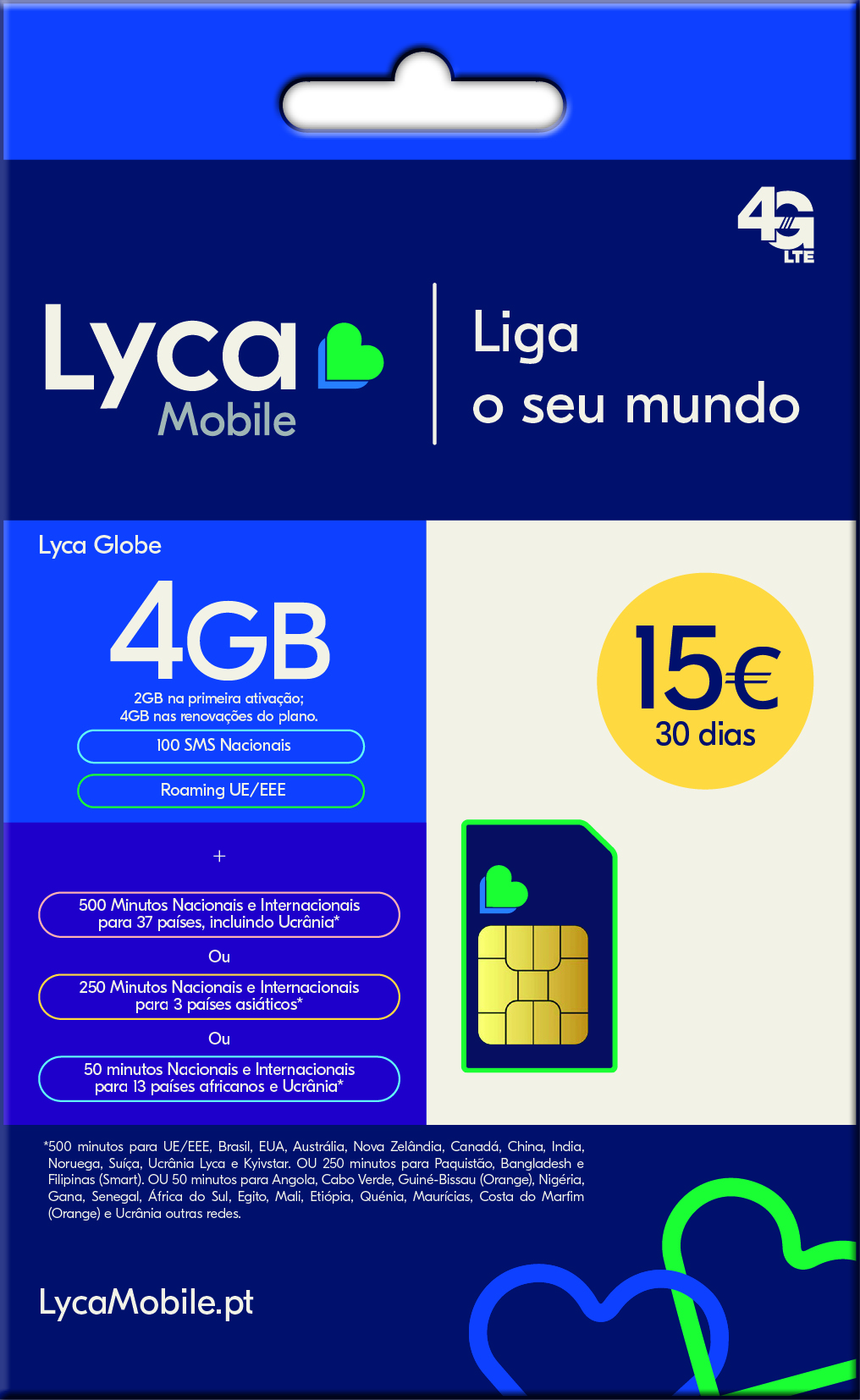 Se o consumidor estrangeiro que vive em Portugal ou está cá de passagem preferir comunicar através de chamada de voz, em detrimento do uso da internet, pode optar pelo Lyca Globe, o cartão com chamadas internacionais que permite os melhores preços por minuto para países como Brasil, Angola, Cabo Verde ou India. Por 15€, o preço das chamadas para os países incluídos no pacote é de 0.03€ por minuto/sms.